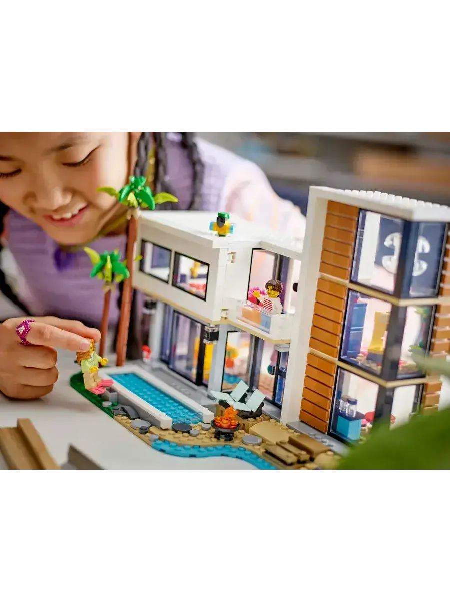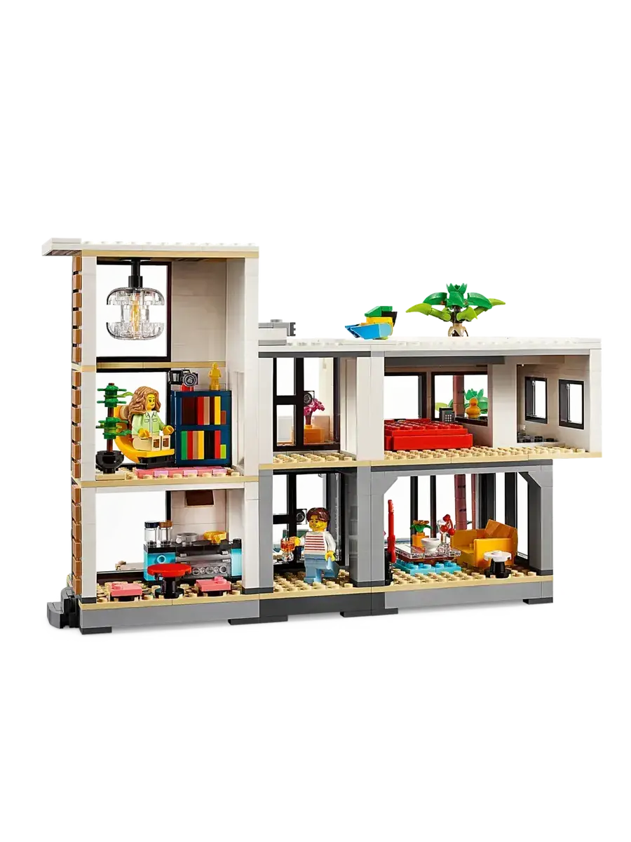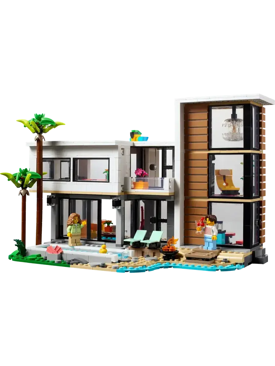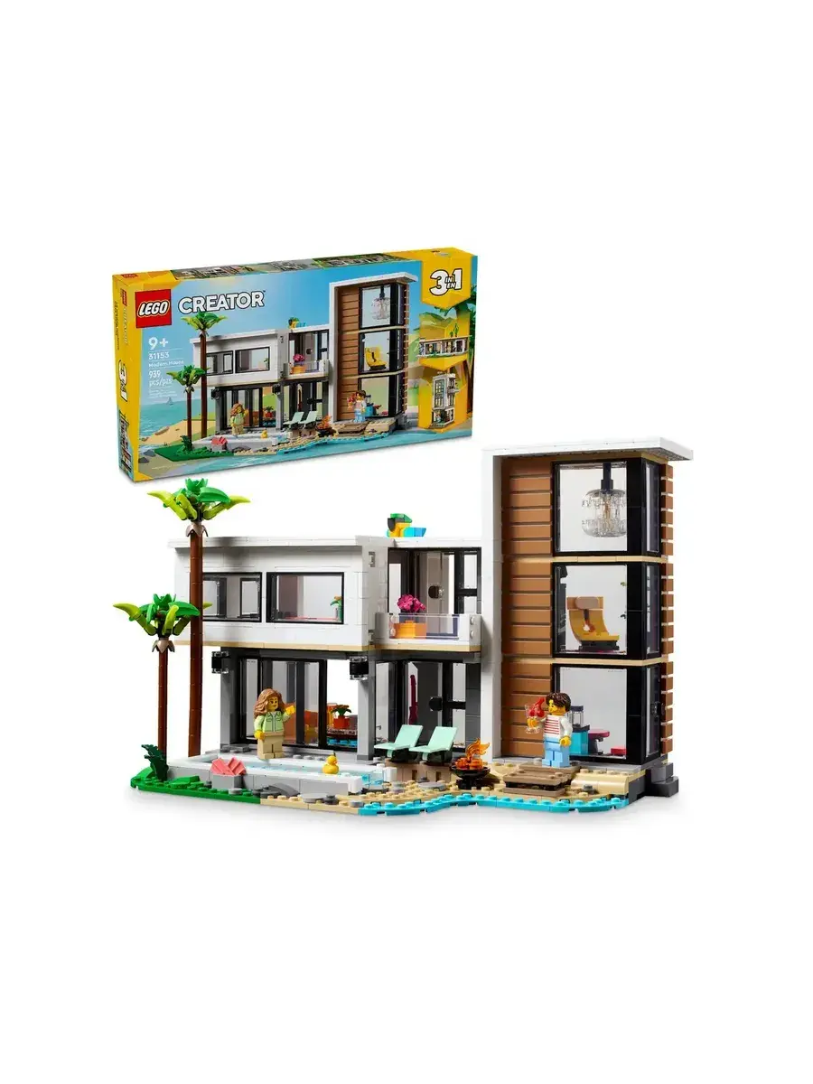 LEGO Creator 31153 Современный дом, 3в1 — это увлекательный конструктор, который позволит ребенку построить не один, а сразу три разных дома! В наборе 939 элементов, из которых можно собрать современный особняк, уютный домик на дереве или стильный многоквартирный дом. В комплекте также две фигурки, которые оживят игру и подарят множество возможностей для ролевых игр. Конструктор изготовлен из прочного ABS-пластика и совместим с другими наборами LEGO, что открывает безграничные возможности для творчества.Мальчики и девочки в возрасте от 9 лет могут собрать три разных игрушечных домика с помощью набора LEGO Creator «Современный дом» (31153). Роскошный двухэтажный пляжный домик с бассейном расположен в тени двух пальм и включает в себя кухню, гостиную, читальный зал, спальню, ванную комнату с душем, балкон и современную мебель. Этот конструктор предлагает мир захватывающих игровых возможностей.