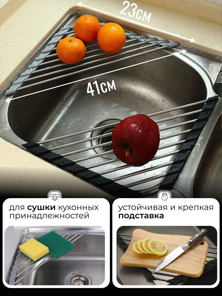 Сушилка на раковину, угловая из 9 звеньев, оазмером 41 на 24 см, это актуальная вещь для каждой хозяйки. Металлическую решетку для раковины можно использовать для сушки посуды, овощей, фруктов, разморозки продуктов, остывания выпечки и как подставку под горячее, губок.